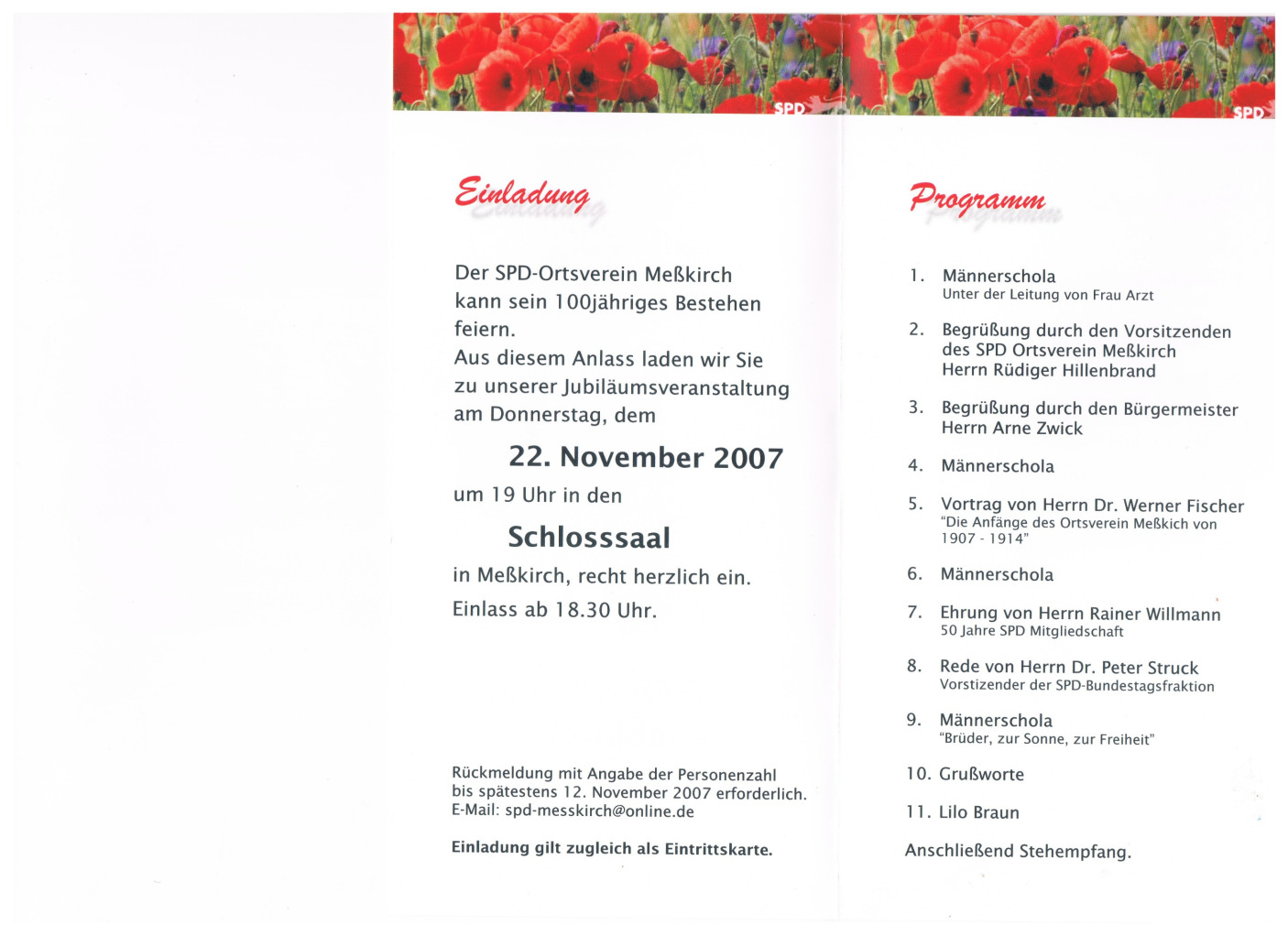 1907 wurde der Ortsverein SPD in Meßkirch gegründet. Die Gründung fand im damaligen Ochsen statt. Der Ortsverein überstand zwei Weltkriege und stellt heute, neben 2 Stadträten auch eine Kreisrätin. Im Jahre 2007 konnte der Ortsverein mit viel Prominenz seinen 100. Gründungstag feiern.
